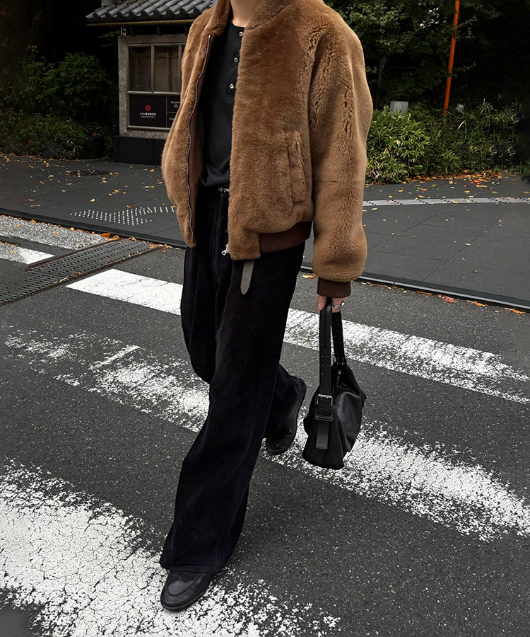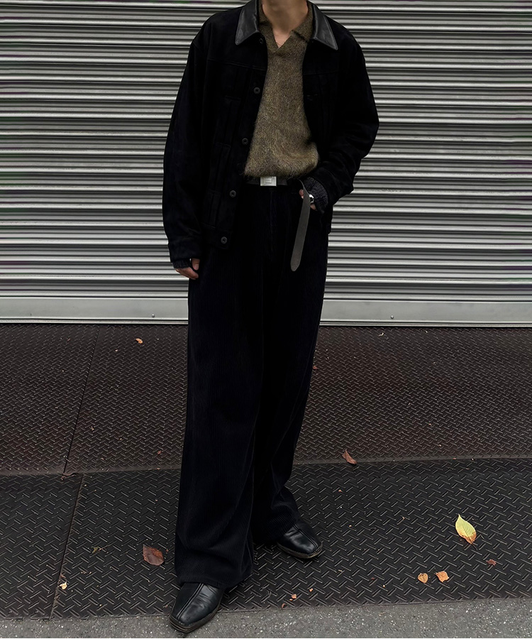 太畝コーデュロイの重厚な見た目とは逆に、素材特有の柔らかなドレープが生まれるよう設計。