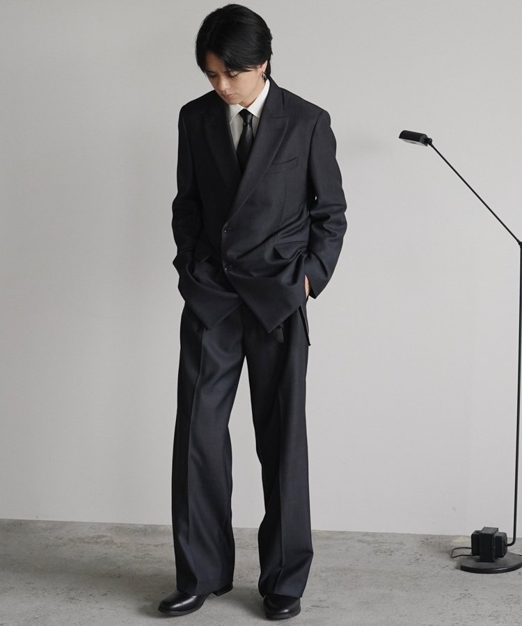ジャケット同様に、通常のスラックスのベルトパーツをなくし、ウエスト周りをスッキリとさせミニマルなデザイン。
