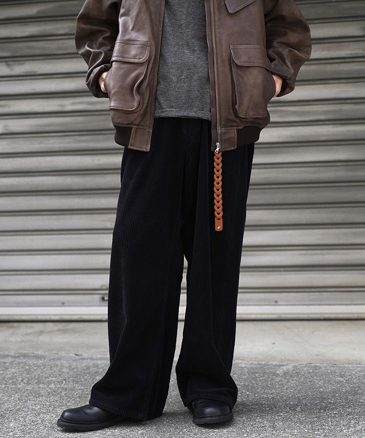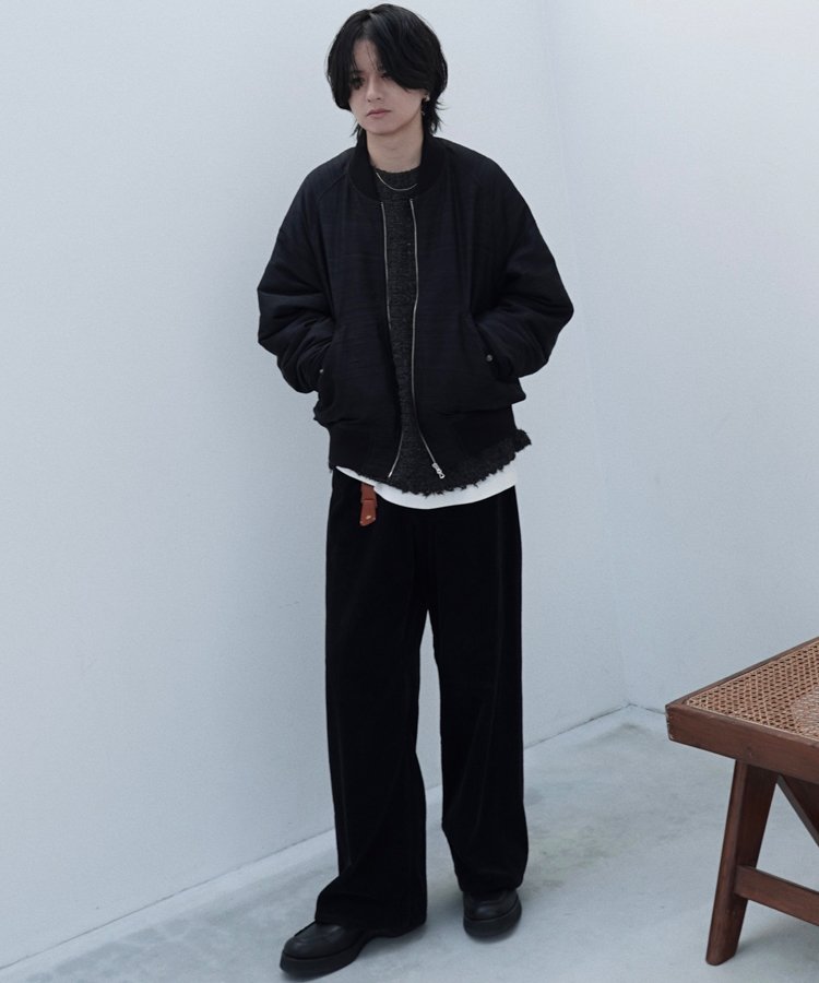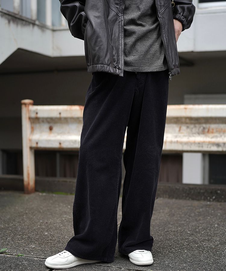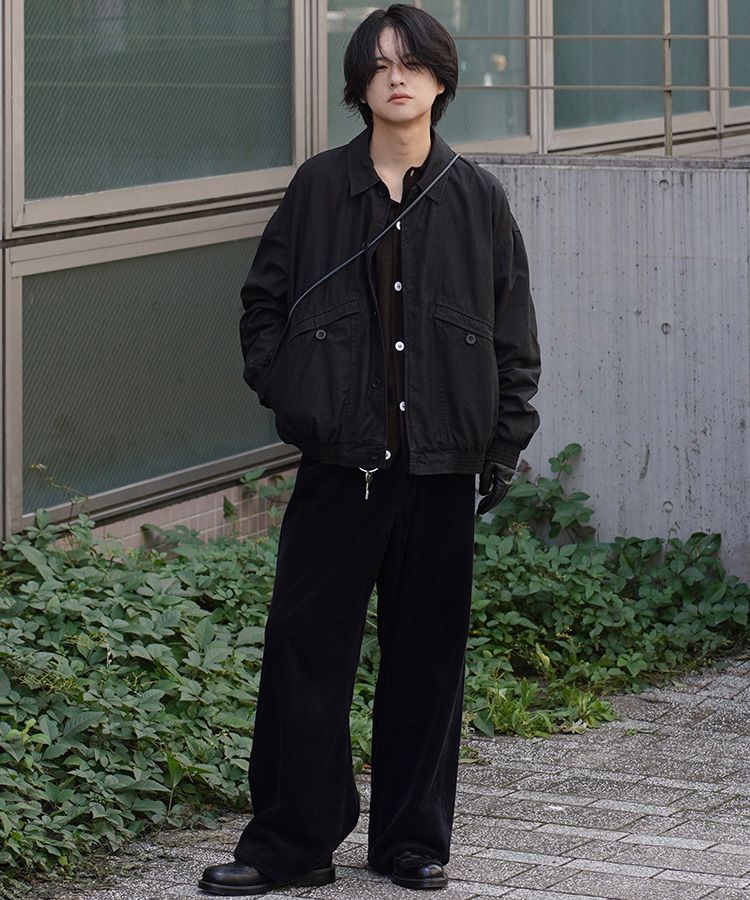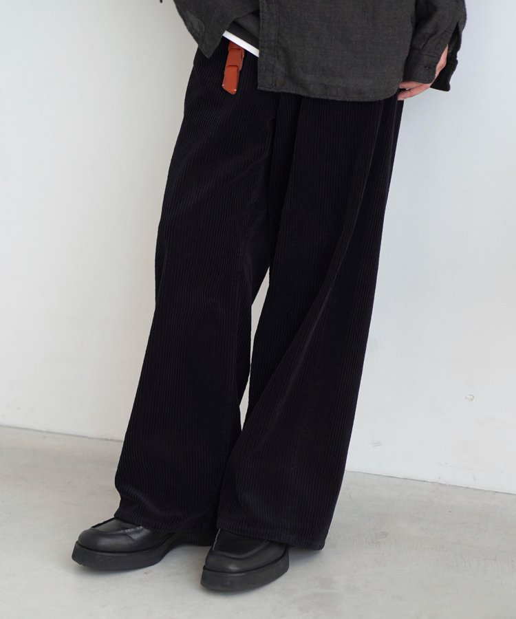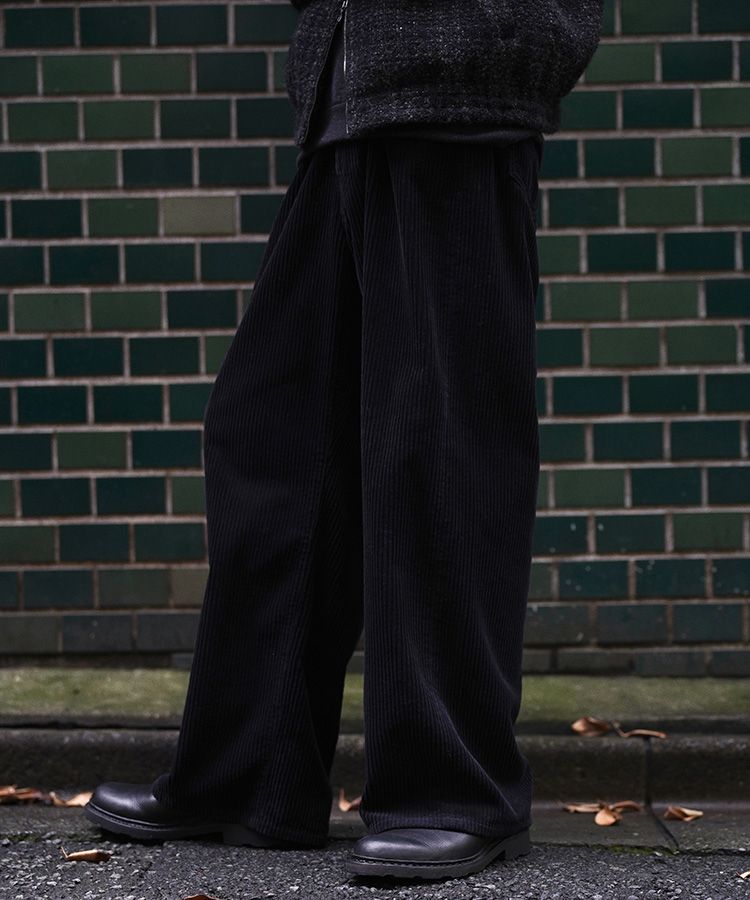 高密度に織り上げた5Wの太畝コーデュロイにウィンス加工を施し、膨らみとドレープ感を引き出しました。