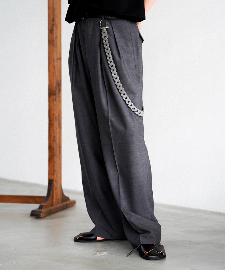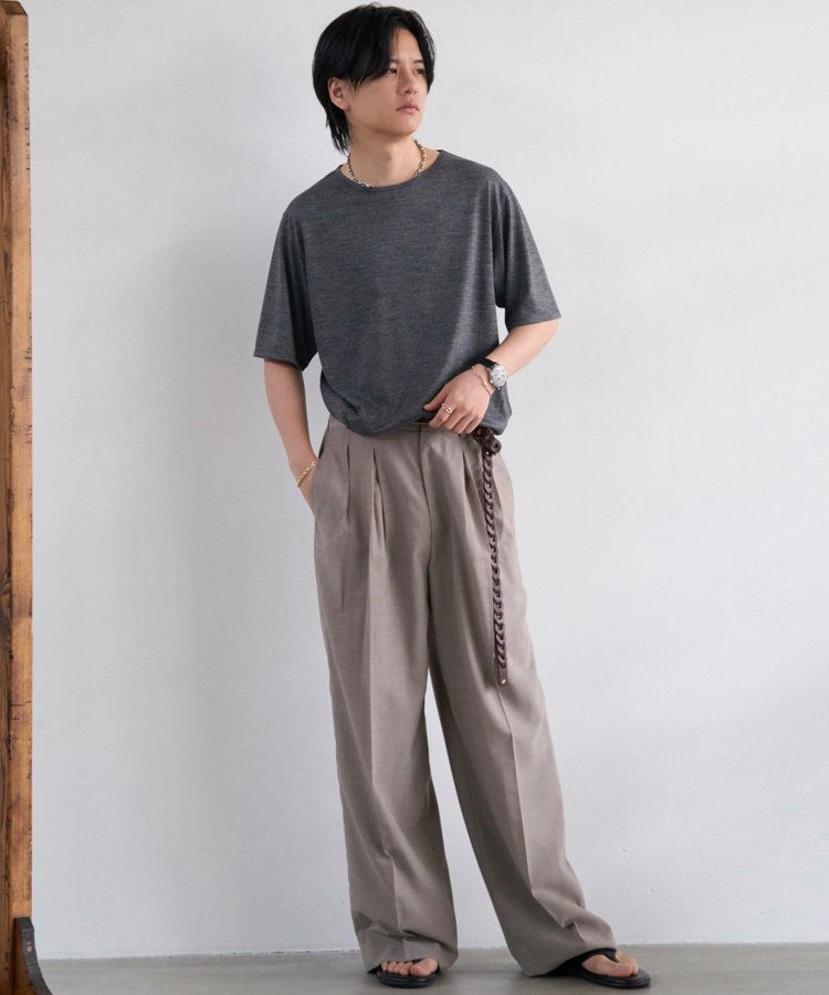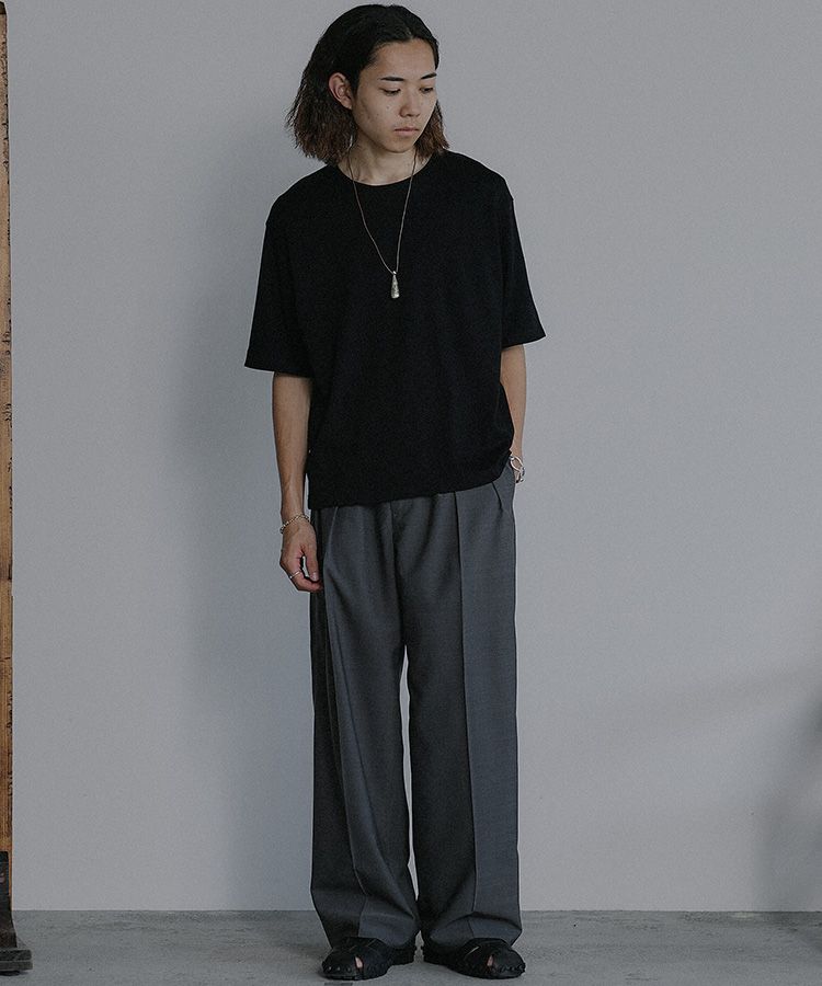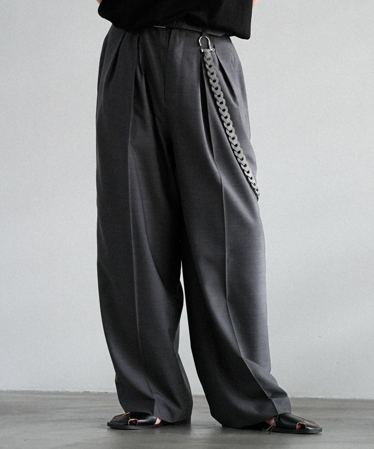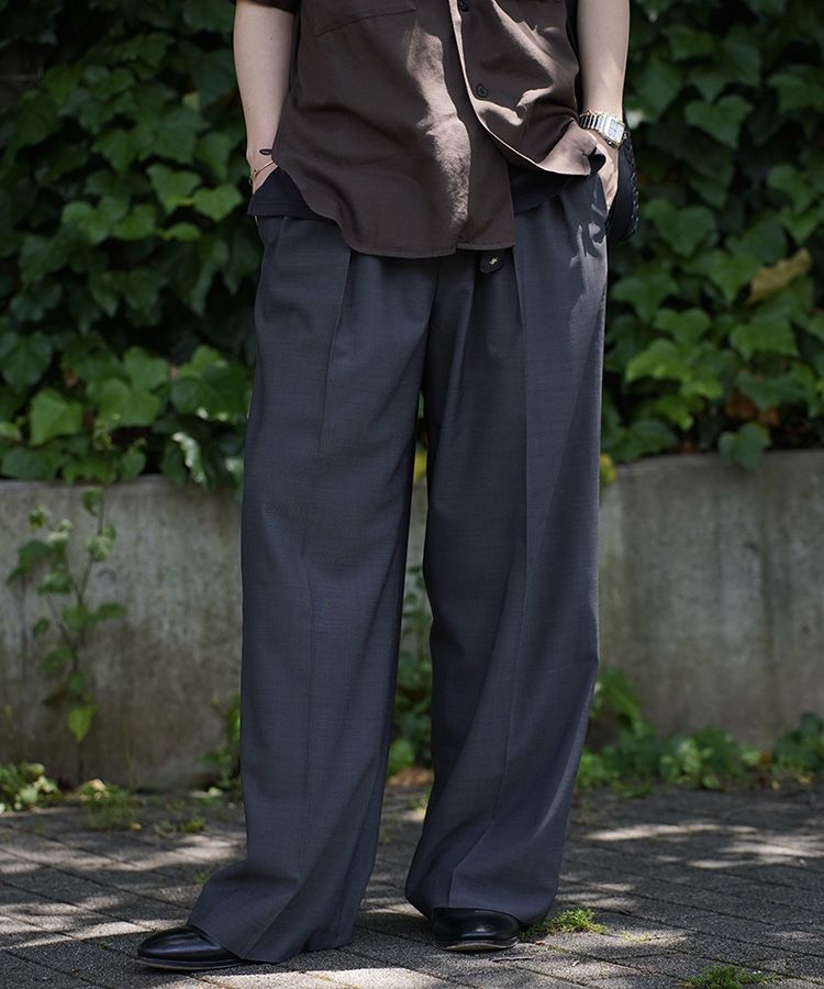 ヴィンテージARMANIをオマージュし、ボックスプリーツと脇側のインタックを組み合わせたワイドストレートシルエット。