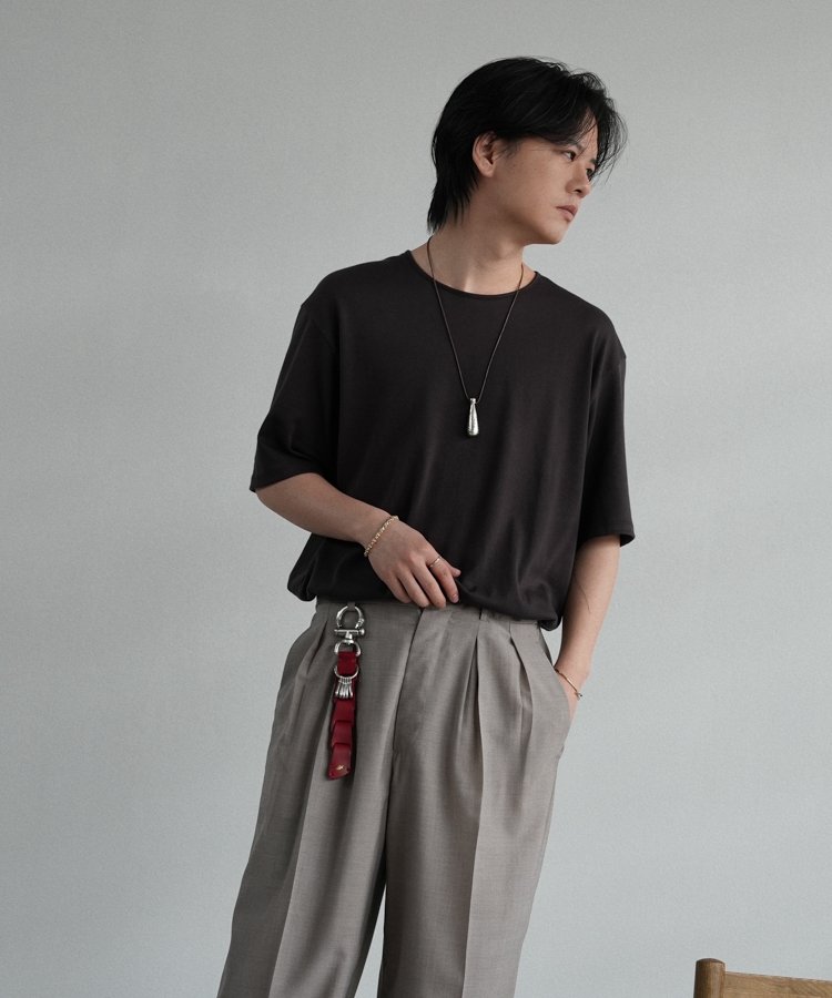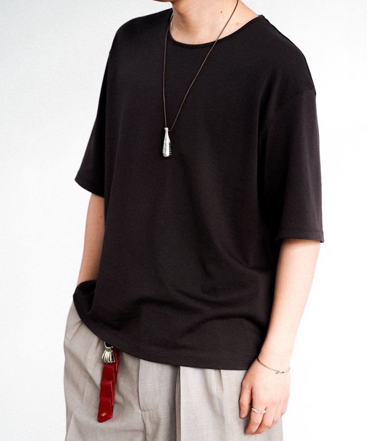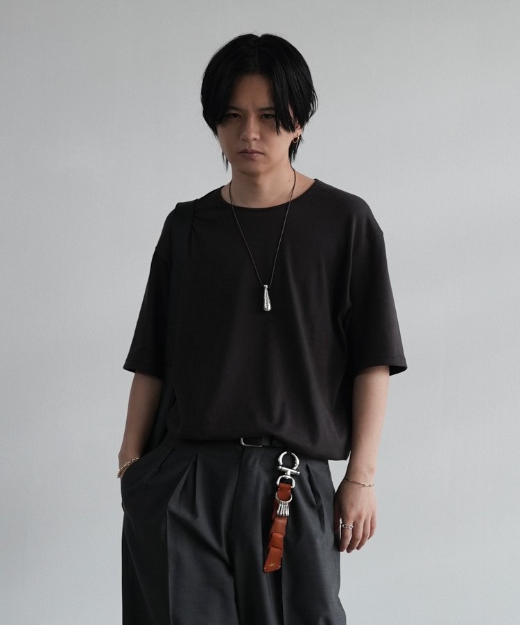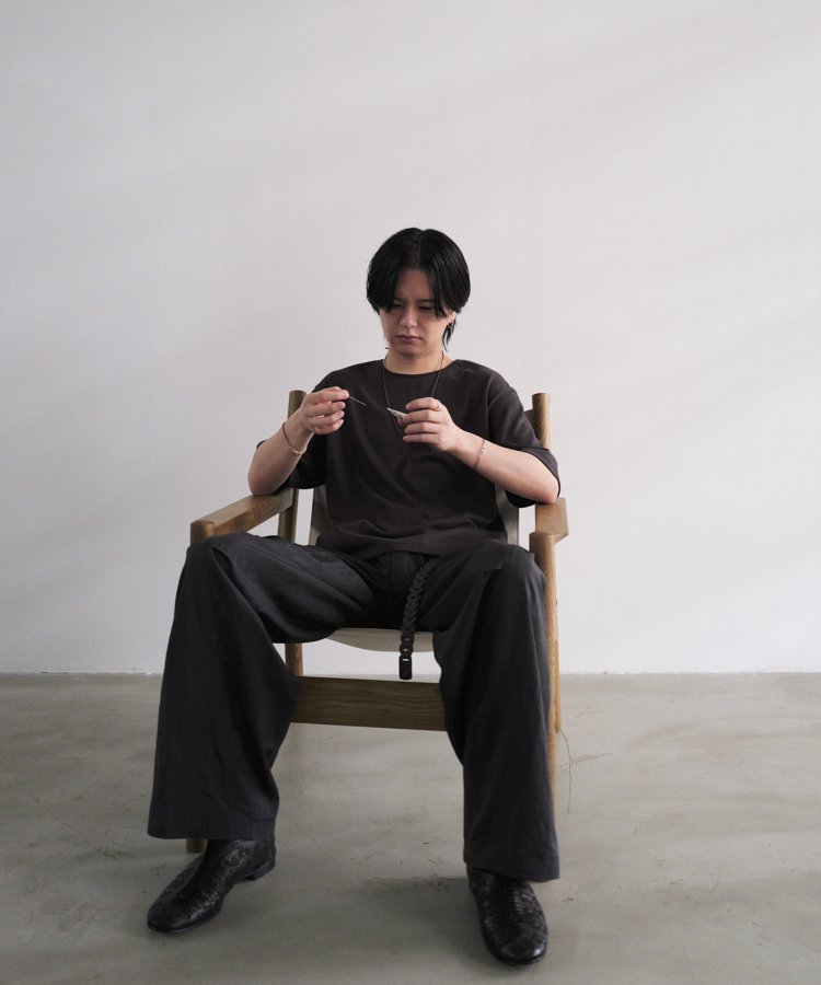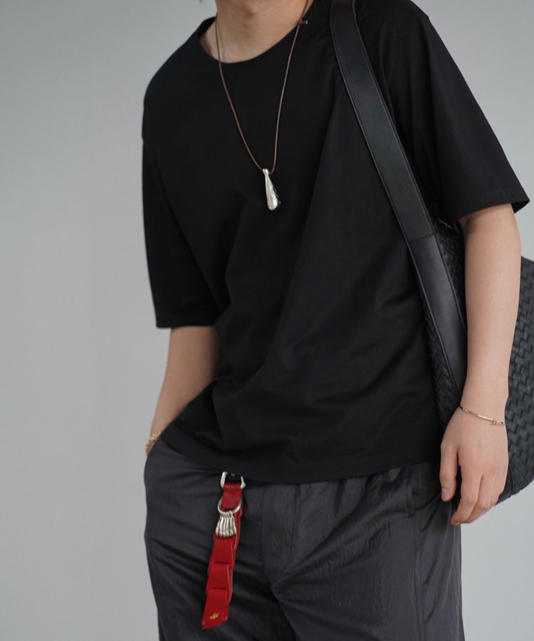 衿を細いバインダー仕様にすることで、中性的なニュアンスのあるTシャツに仕上げました。