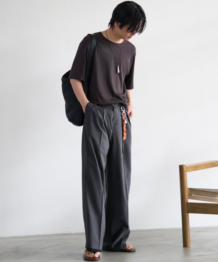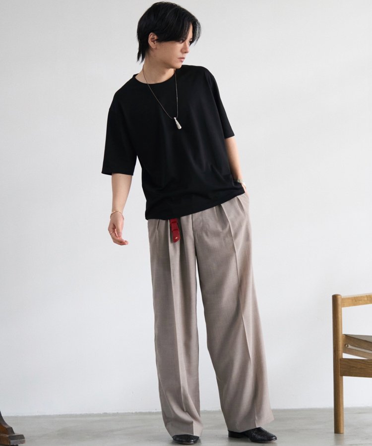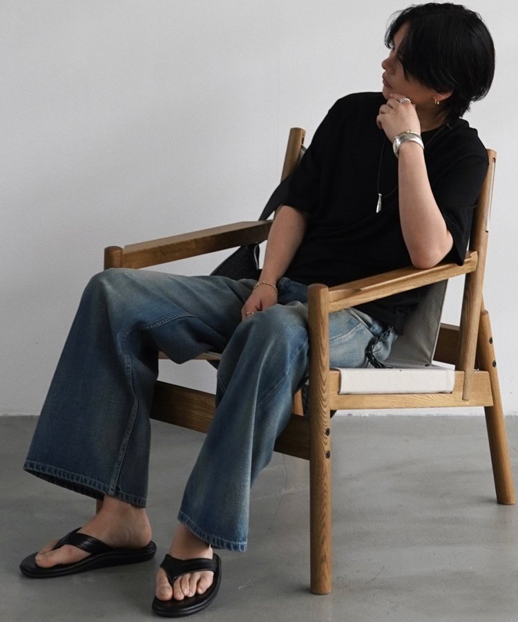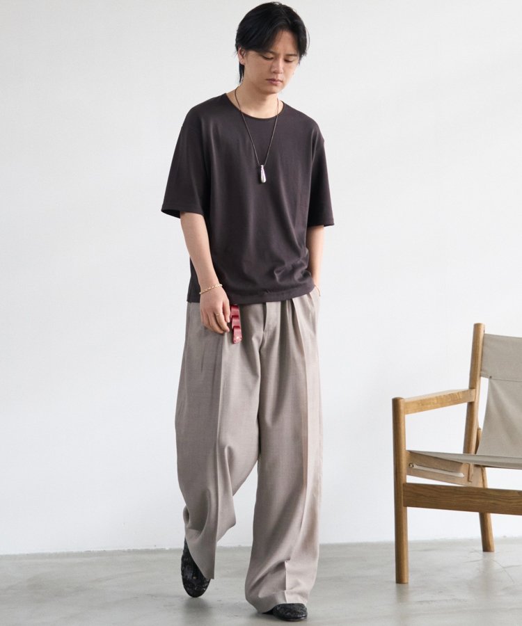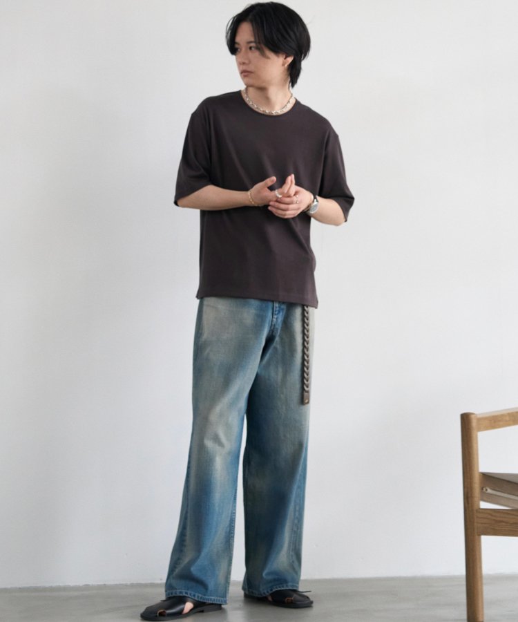 衿を細いバインダー仕様にすることで、中性的なニュアンスのあるTシャツに仕上げました。