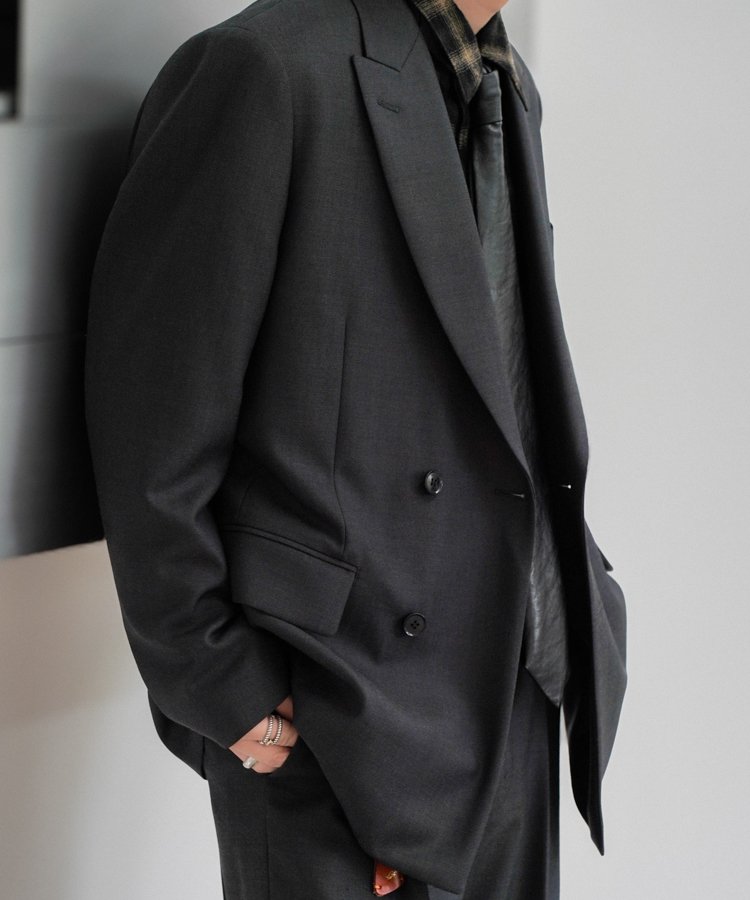 ウールの産地・尾州で甘く織り上げ、タンブラー加工を施すことで美しい落ち感と奥行きのある表情を生み出しています。