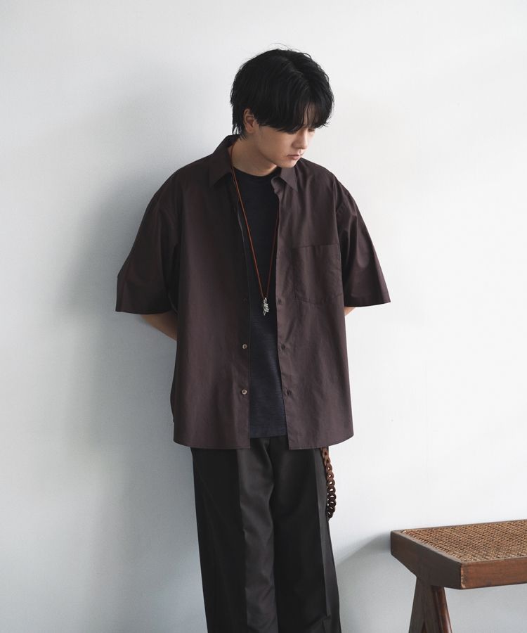 COTTON 100%100/1の超長綿を使い、159本×140本の甘い打ち込みで設計したツイル素材。一見、オーソドックスな平織りブロード素材ですが、敢えて2/2の綾組織で織り上げました。染色は液流染色機を用いて時間をかけて揉み込みながら染め、その後にタンブラー乾燥を掛けることで、柔らかく膨らみのある風合いのシャツ地に仕上げています。