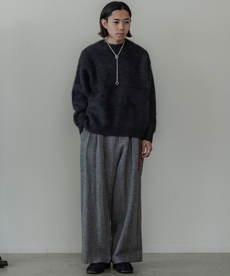 ヴィンテージアルマーニのデザインを掛け合わせ、深い股上やボックスタック、太めのベルトループなど、特徴的なディテールを取り入れました。