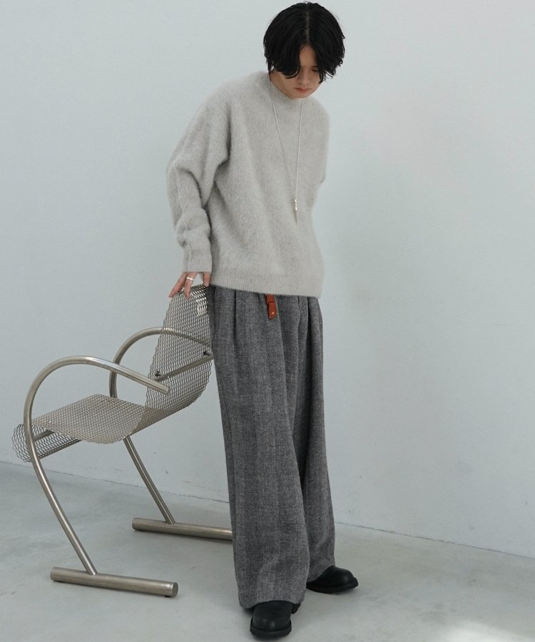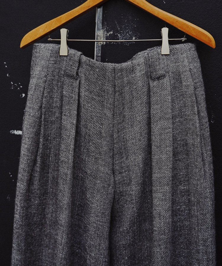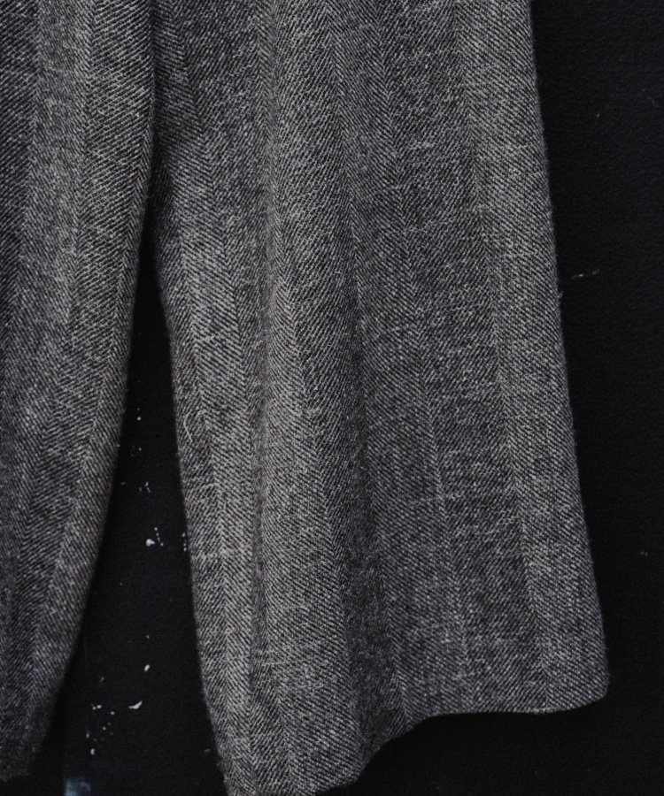 FABLIC : WOOL 80% LINEN 20%KNEE LINING : CUPRA 100% イギリスのシェットランドウールとリネンを混紡し織り上げたツイード素材。シェットランドウール特有のオーセンティックな雰囲気と、リネンの艶感を掛け合わせた絶妙なバランスの素材です。長時間のタンブラー加工を施し、柔らかい風合いに仕上げています。
