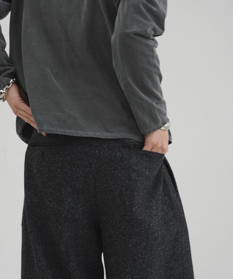白い生地に黒の顔料染めを施し、加工専用ネットで洗い加工を施すことで、独特のひび割れ感を表現しています。