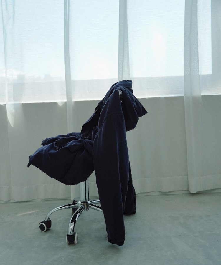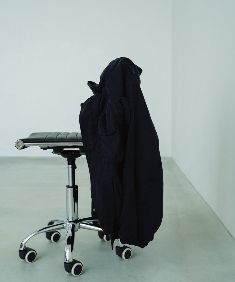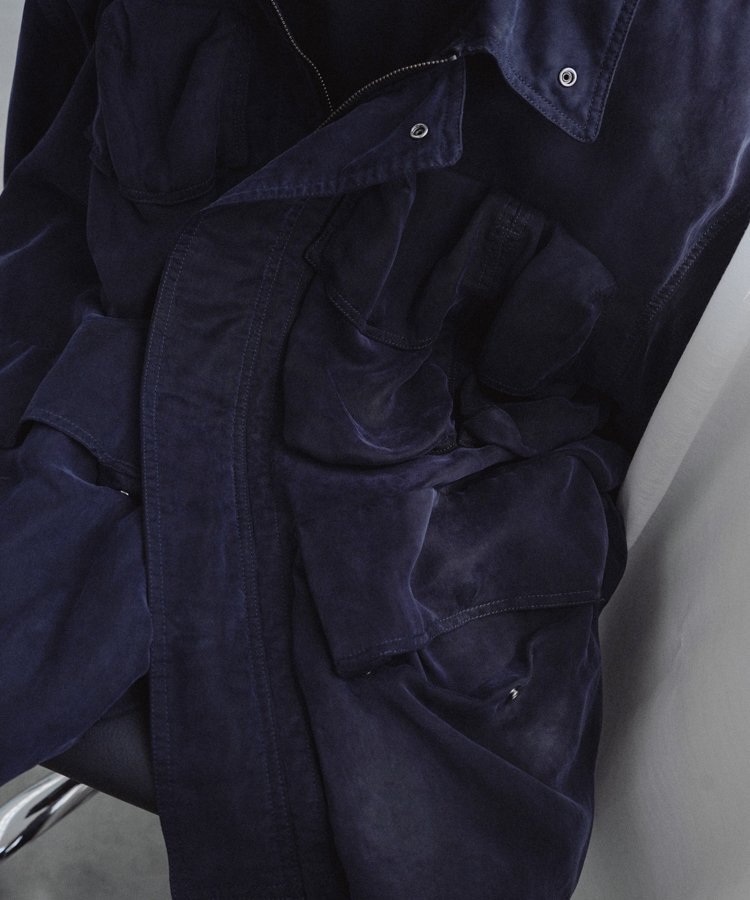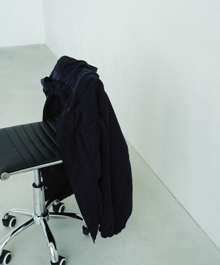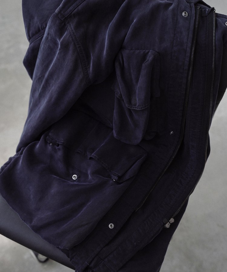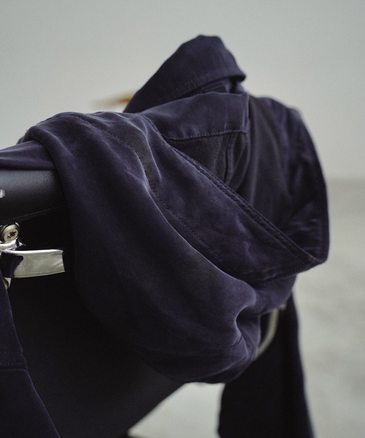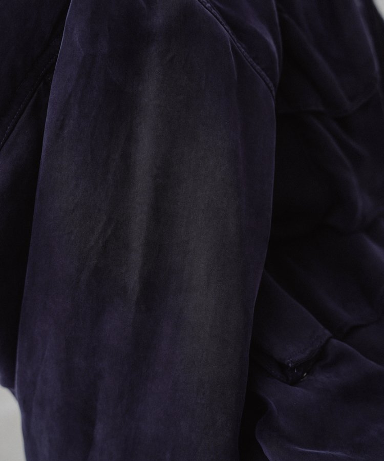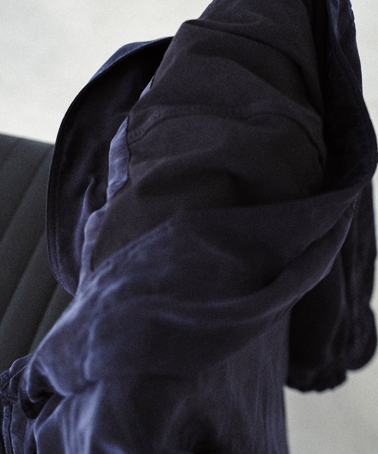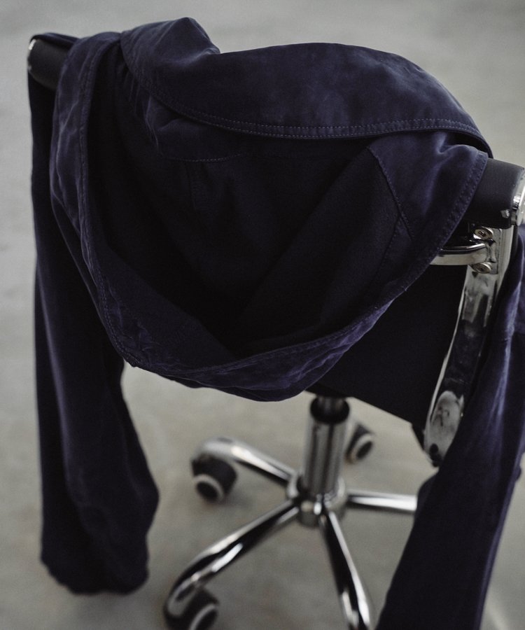 高密度に織り上げたキュプラツイル素材に、フィブリル加工を施し、ミクロレベルの起毛感とフェードした色味が特徴。