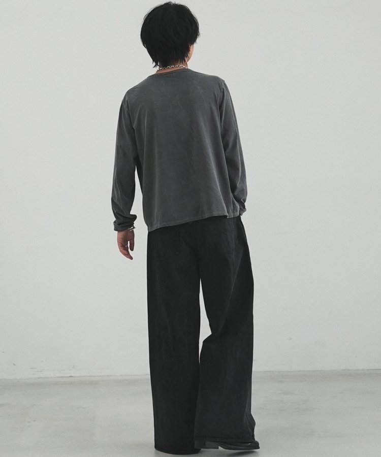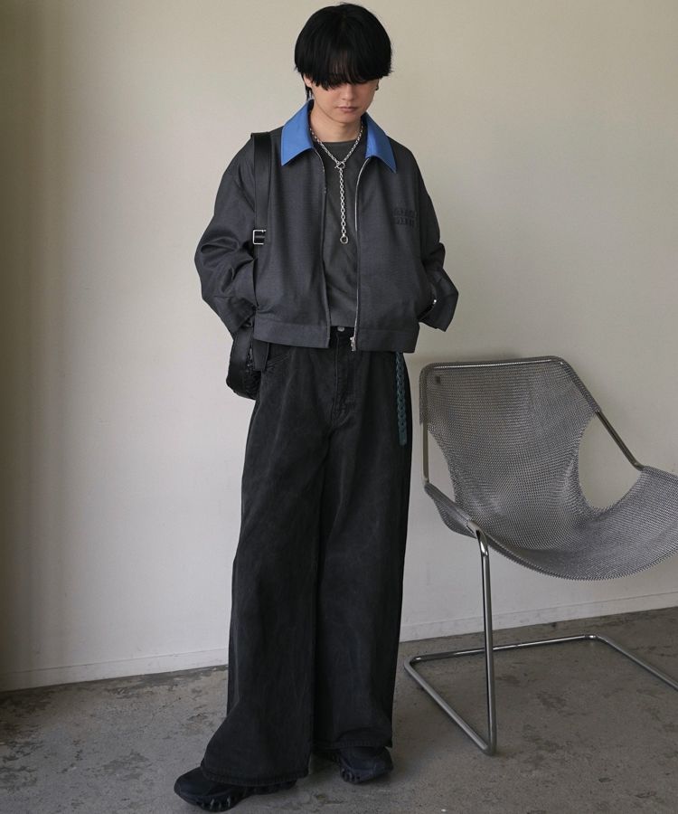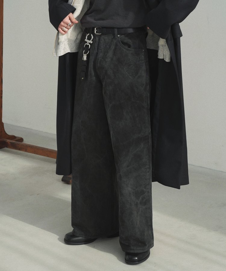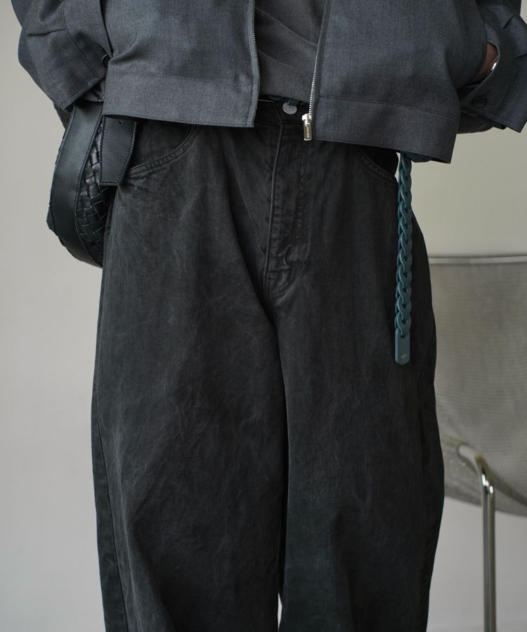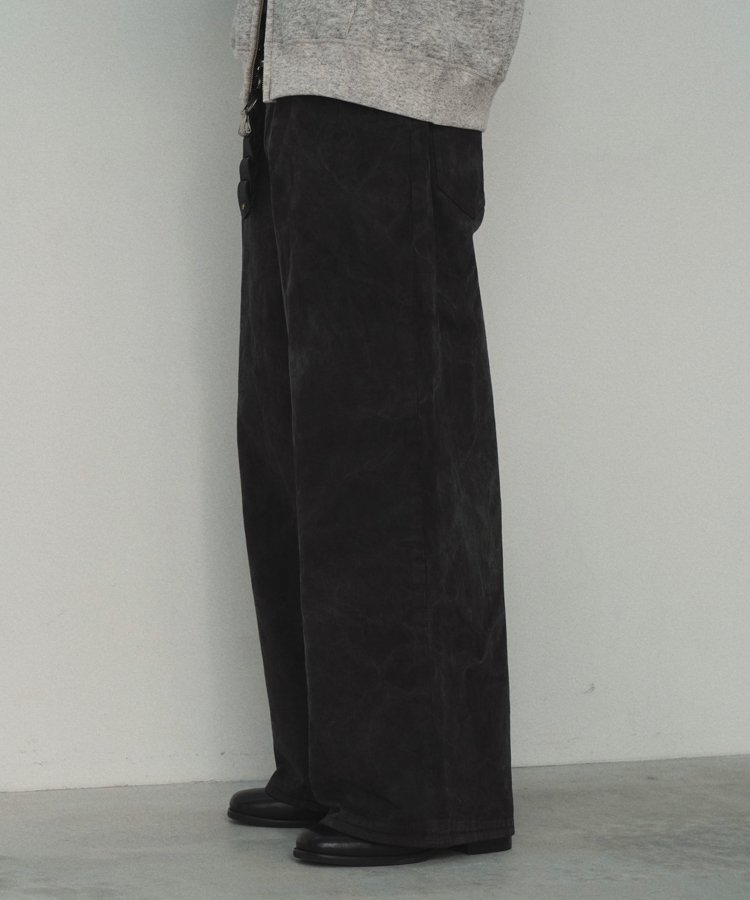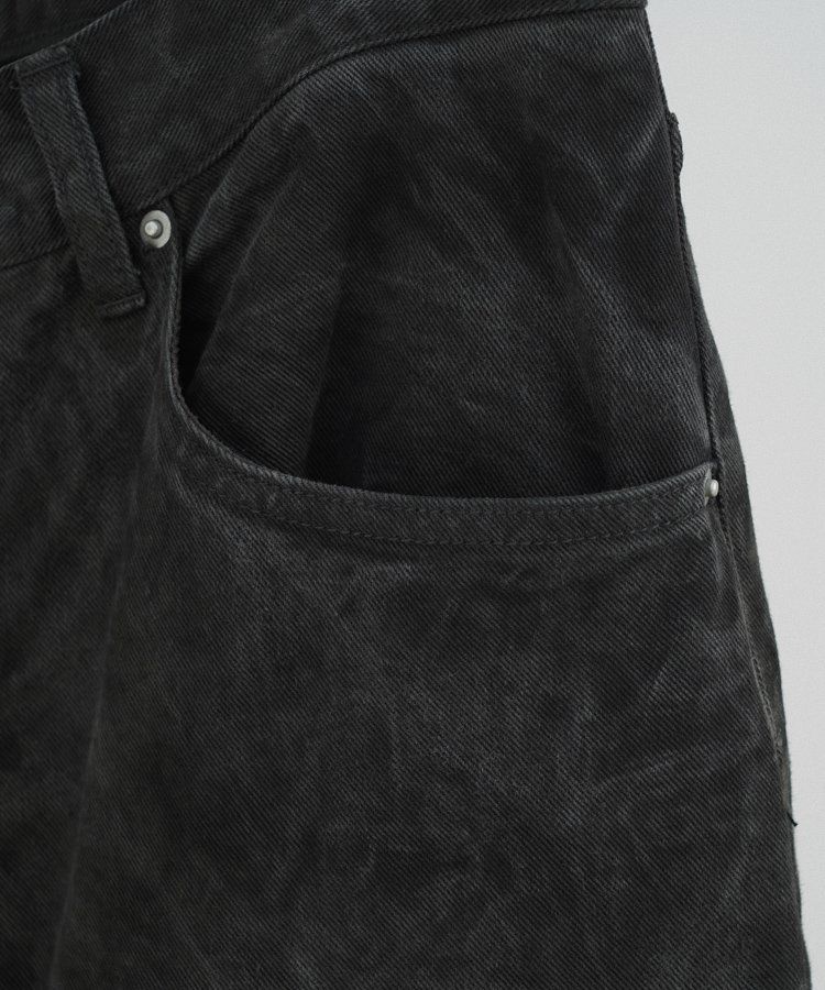 黒デニムを一度ブリーチした後、再度顔料染めと洗いをかけることで、独特のひび割れ感を表現。