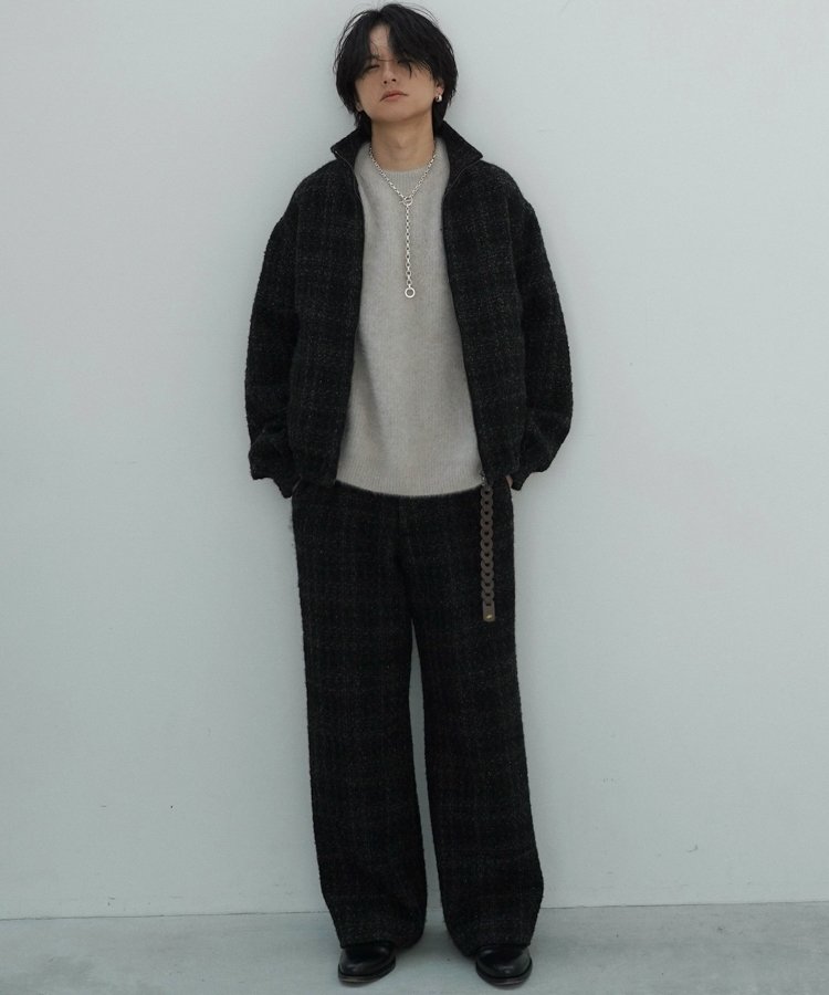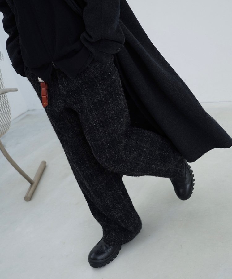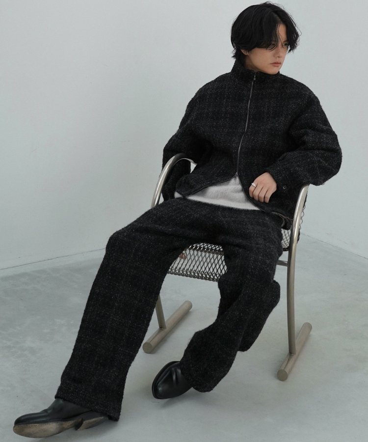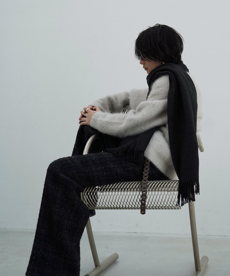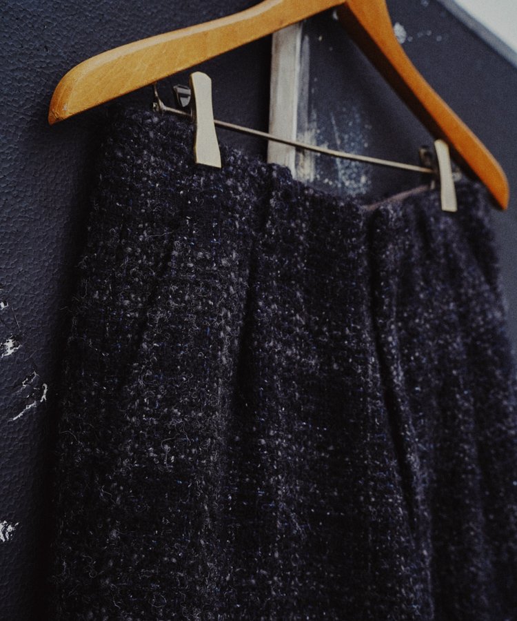 ウールアルパカのループ糸と希少なシルク100%の杢糸を交織し尾州で織り上げたツイード素材。
