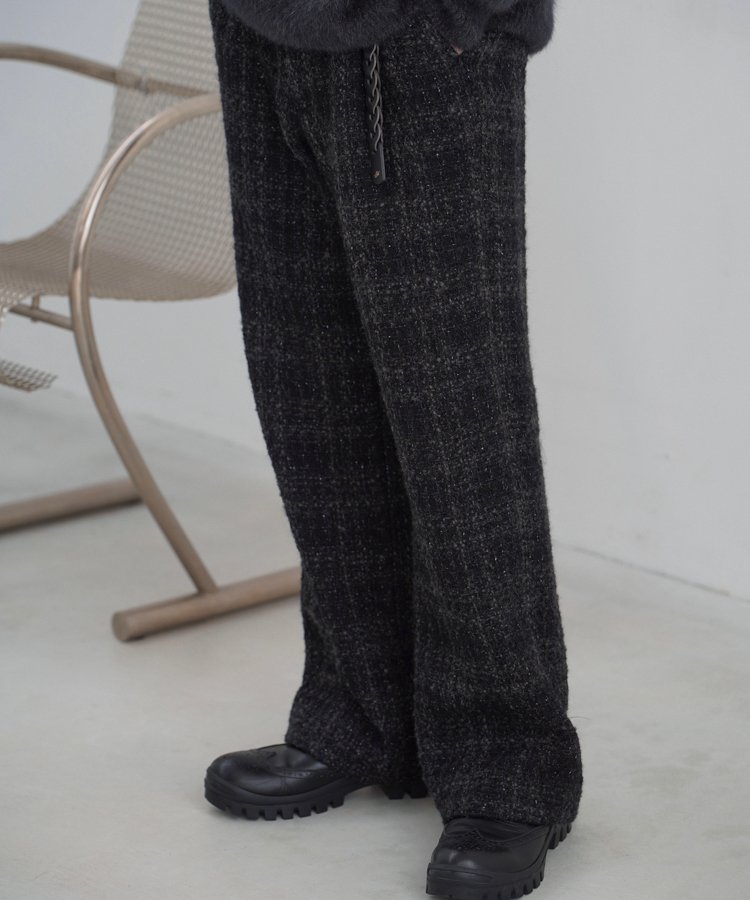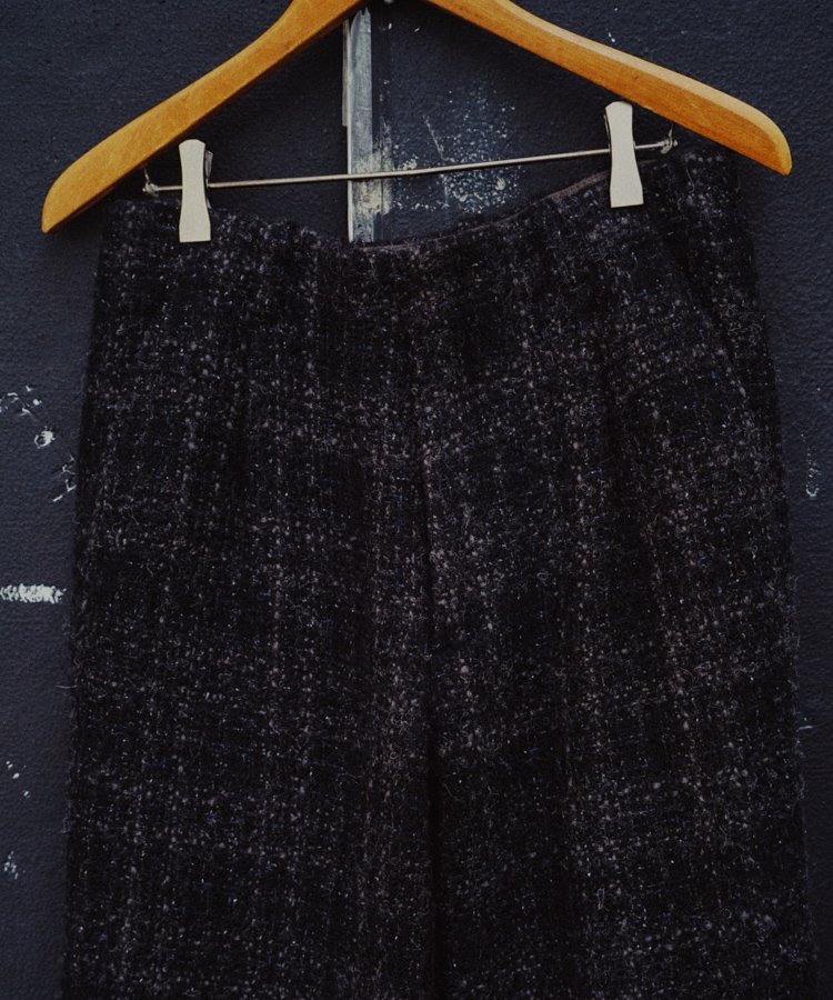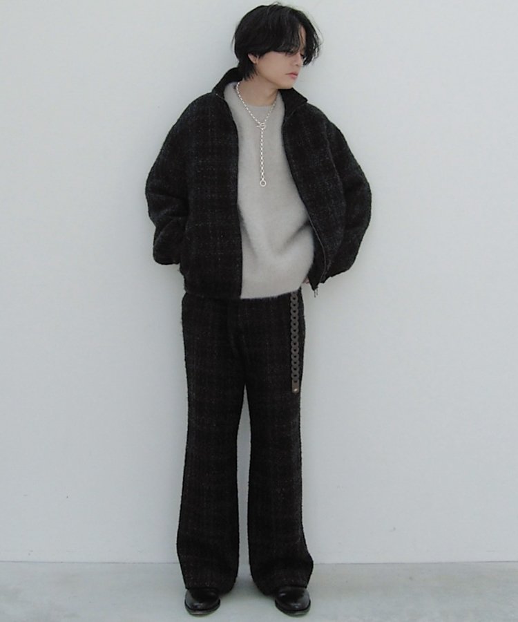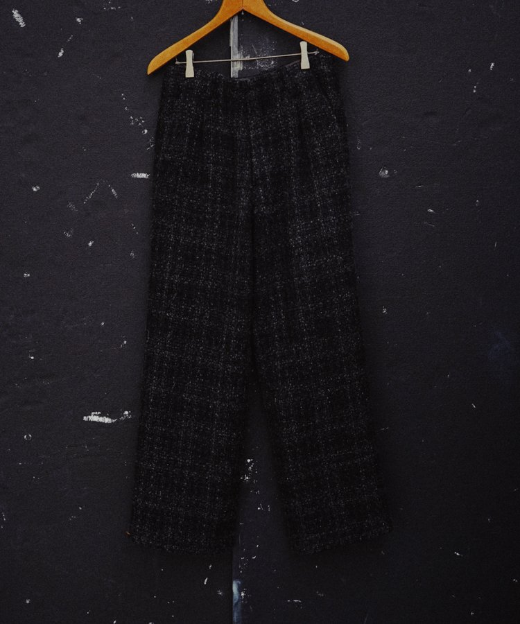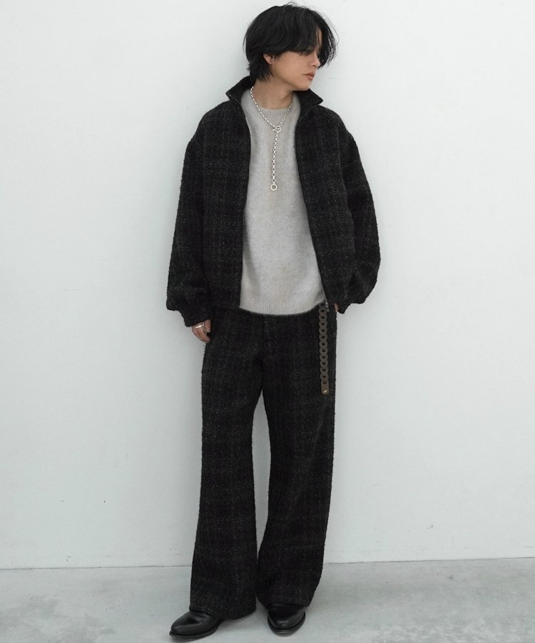 ウールアルパカのループ糸と希少なシルク100%の杢糸を交織し尾州で織り上げたツイード素材。