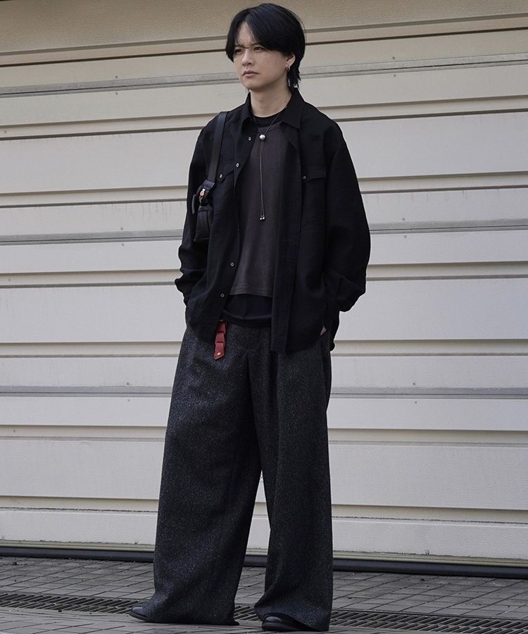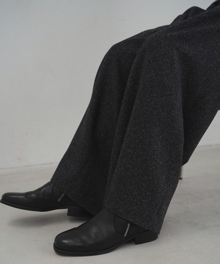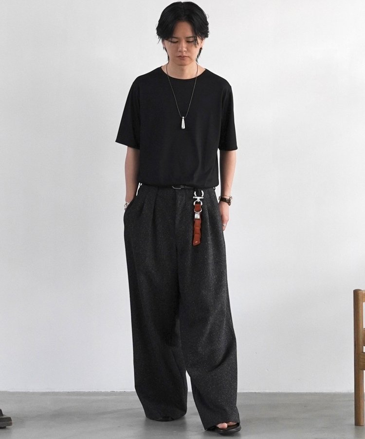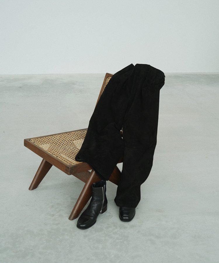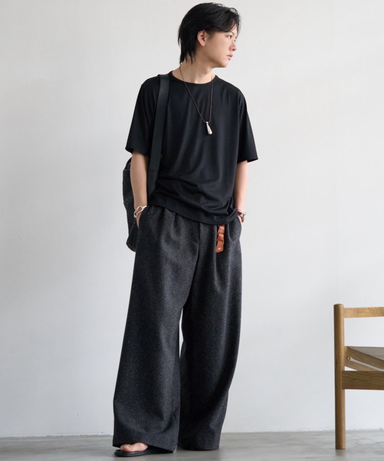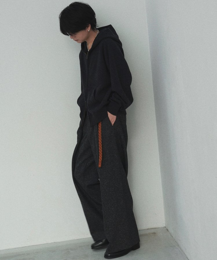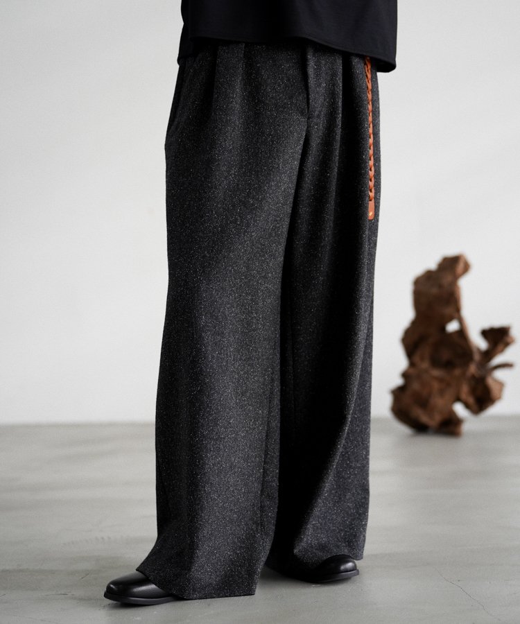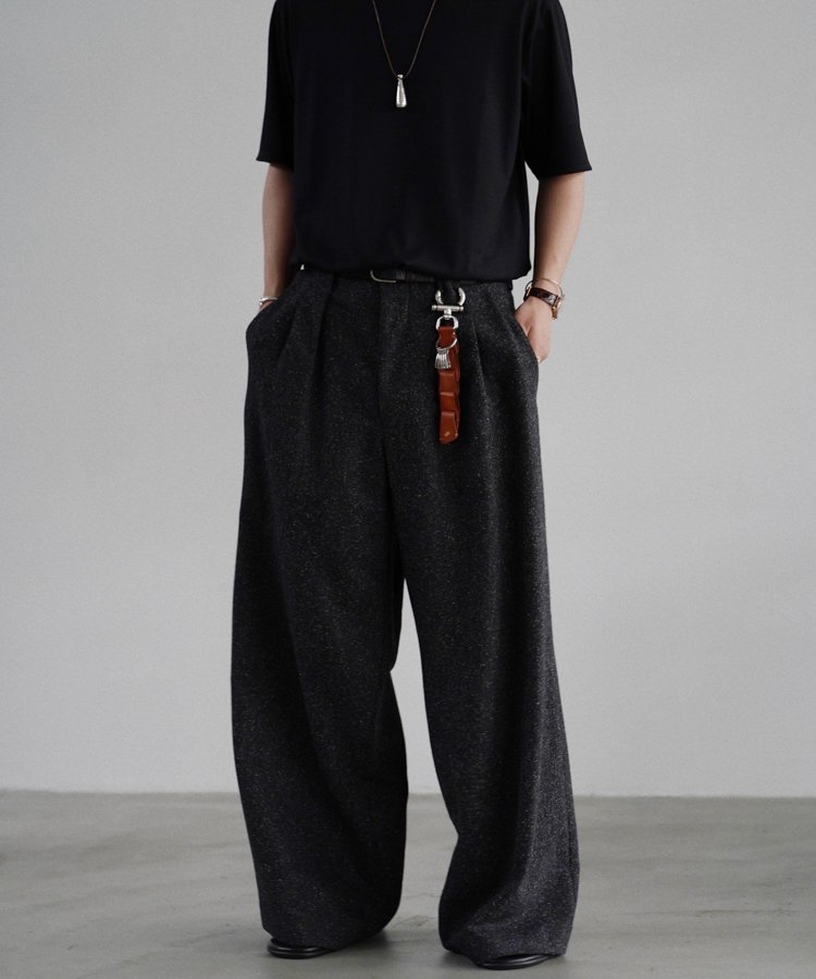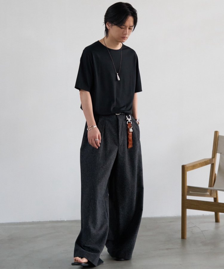 フロントのボックスタックが特徴的な80'sのスラックスをソースに製作。股上を浅めに設定した新たなバギーシルエット。