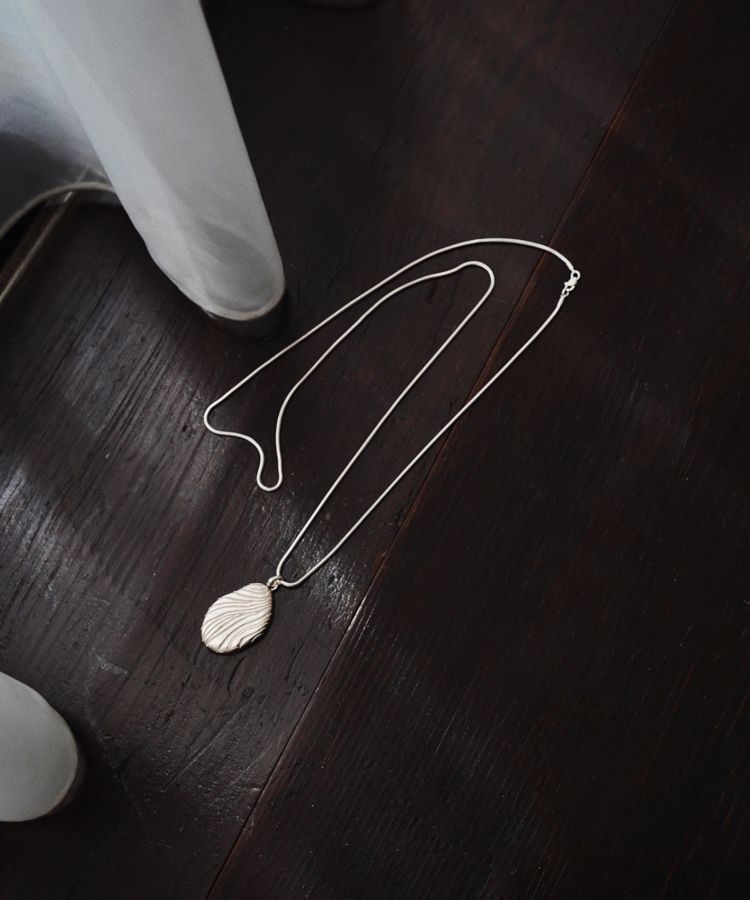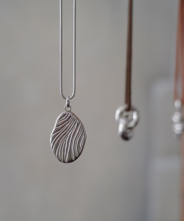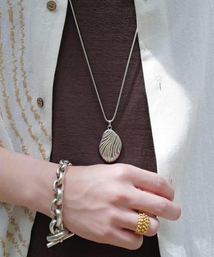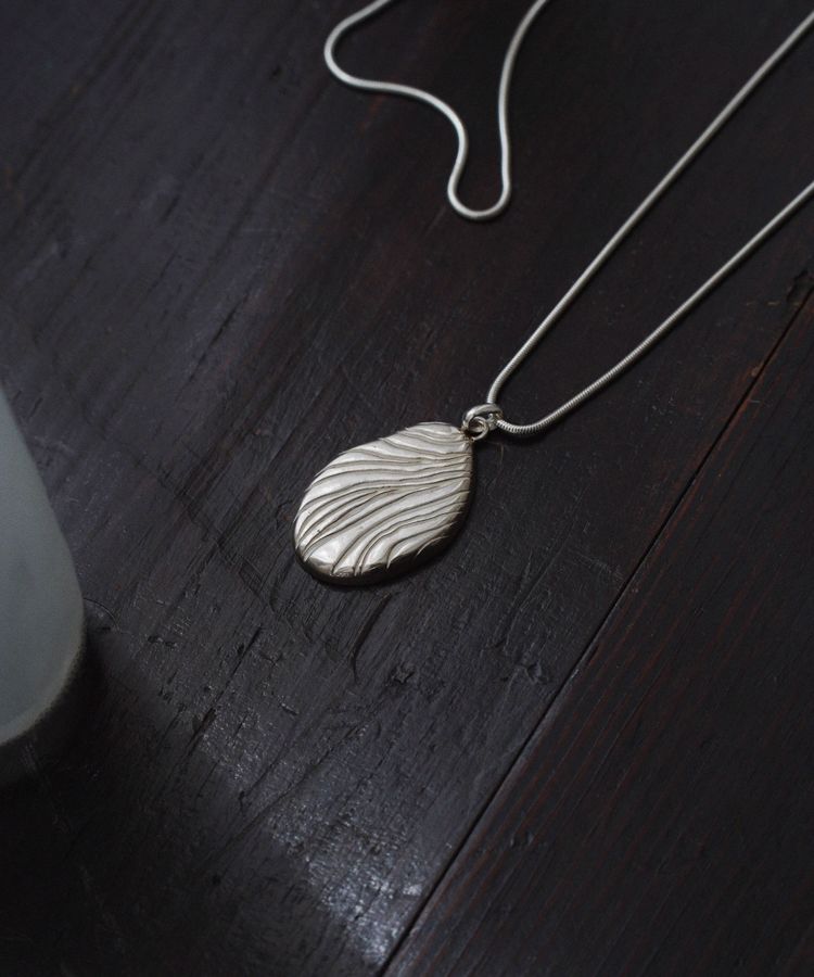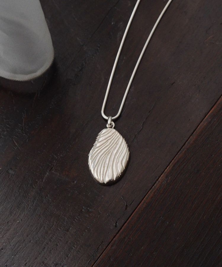 ペンダントトップの表面に掻き落としのテクニックを取り入れ、流れるようなラインを入れています。