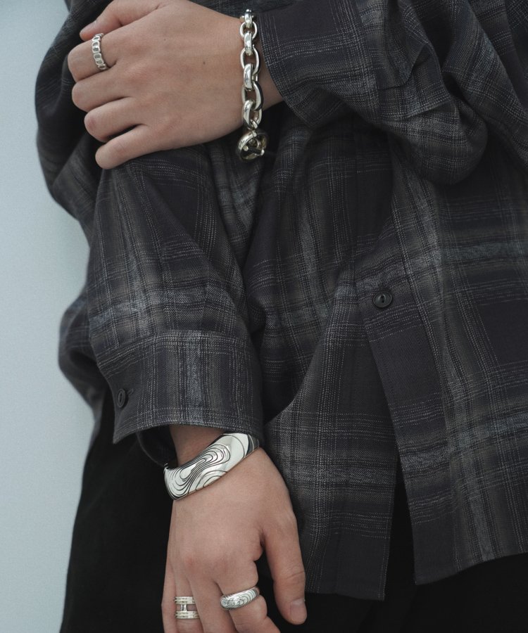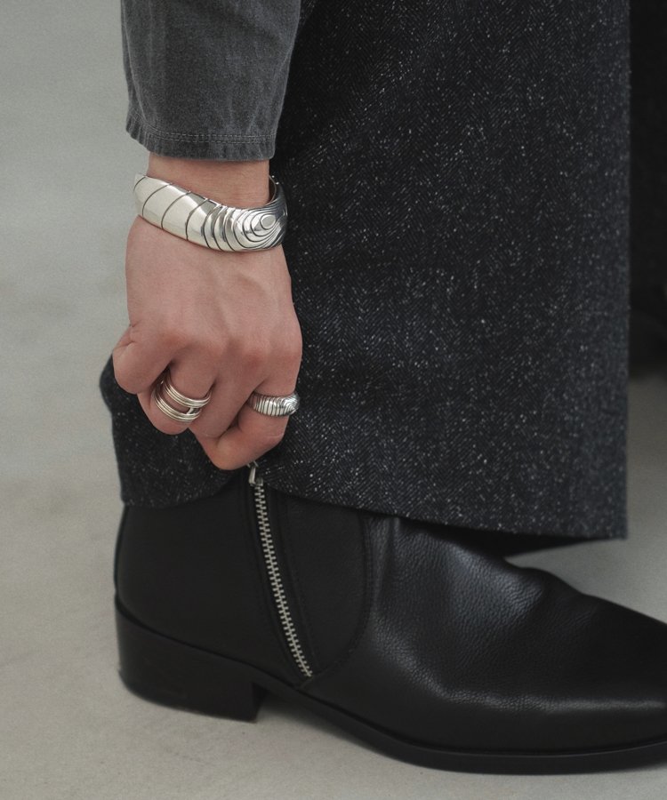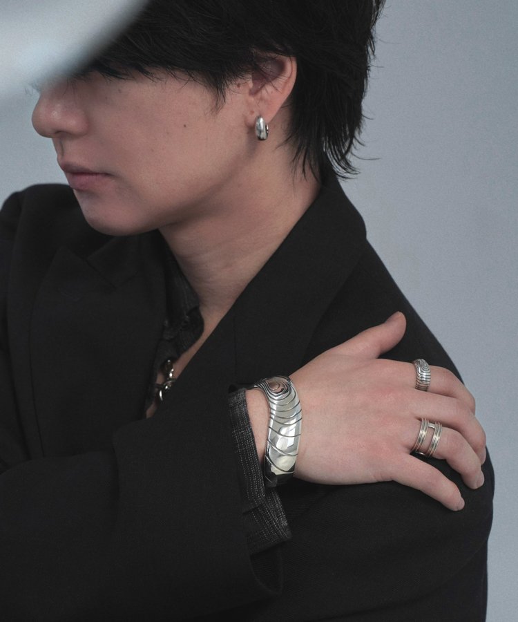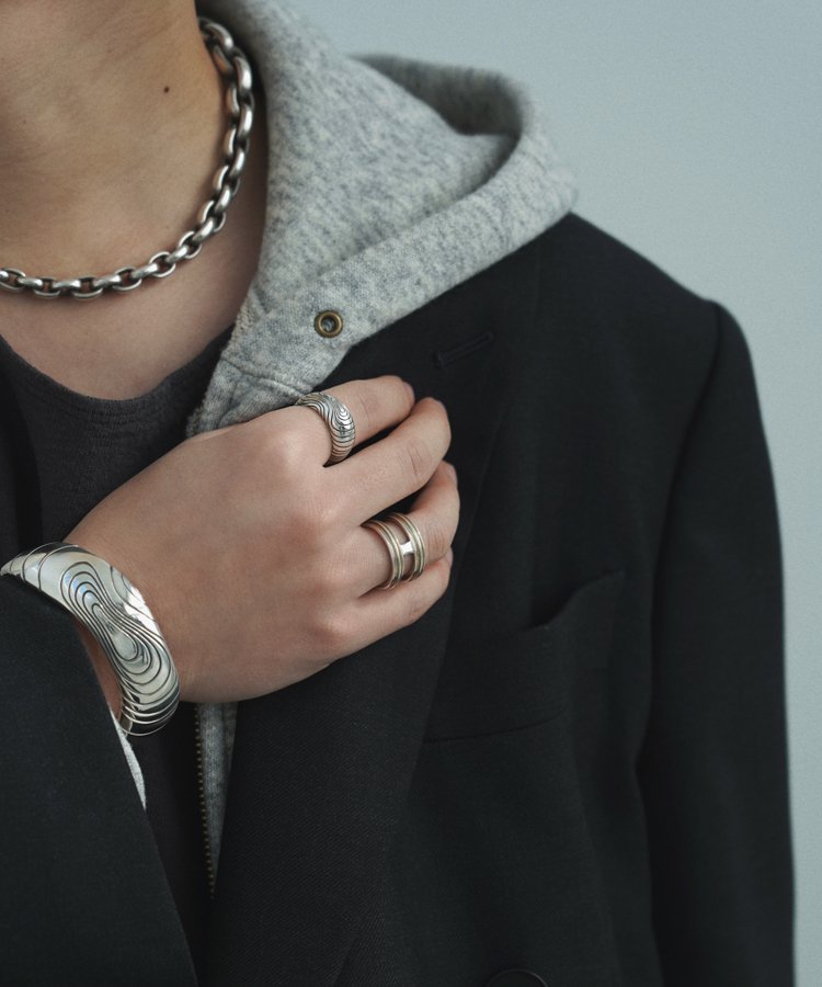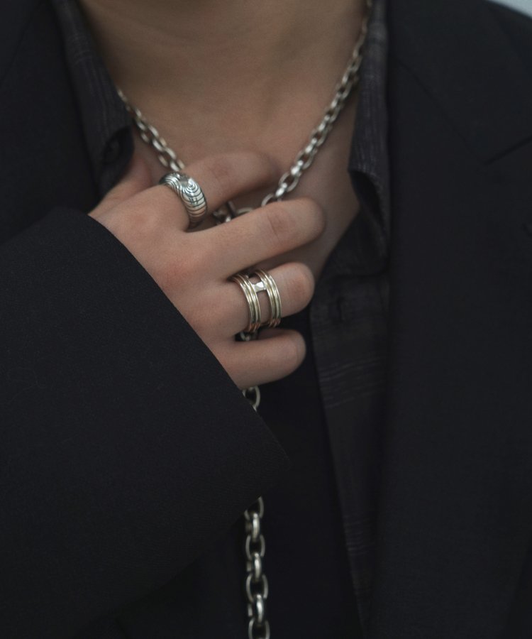 バックルのようなフォルムのボタンをリングに落とし込み、シンプルながら存在感のある形状に仕上げました。