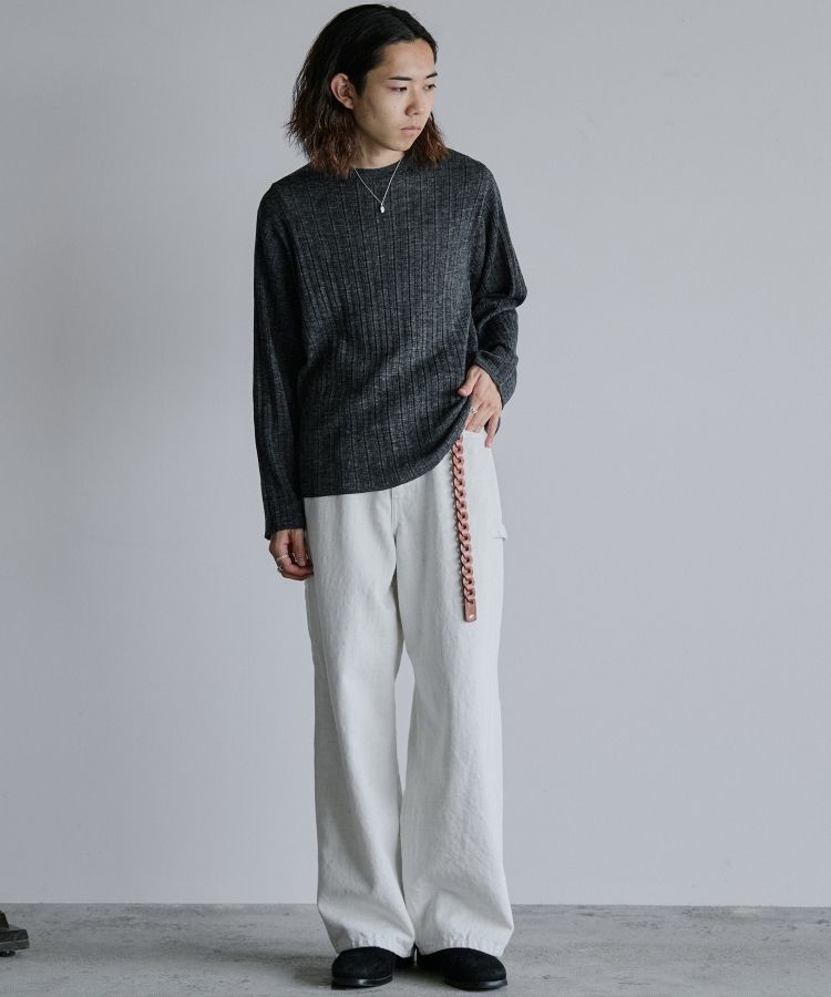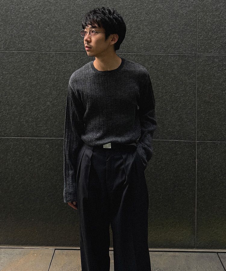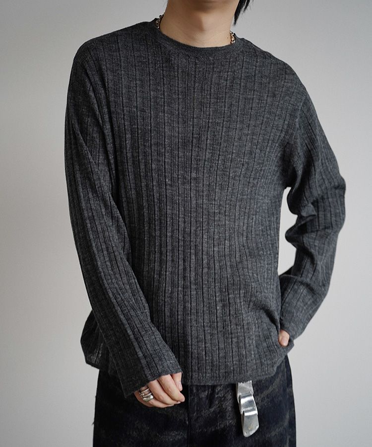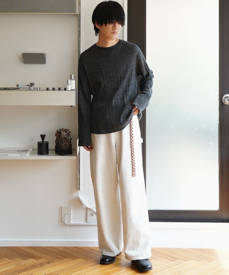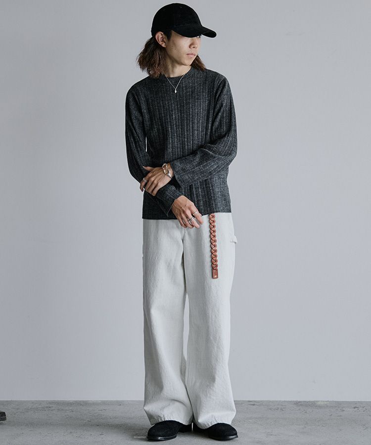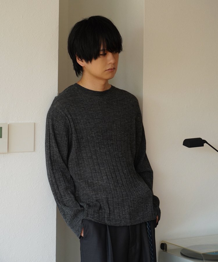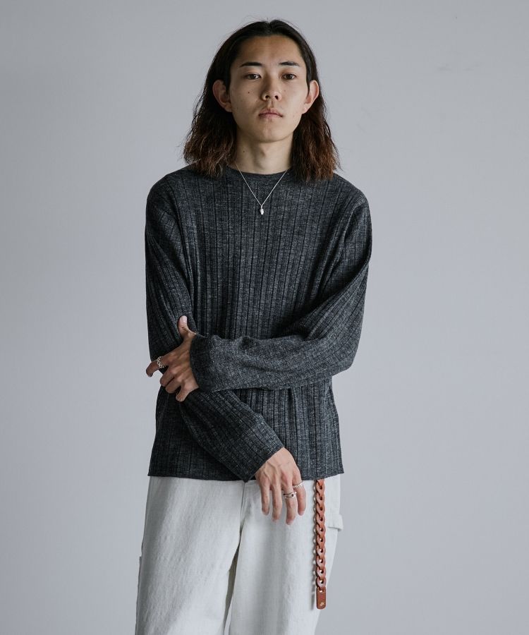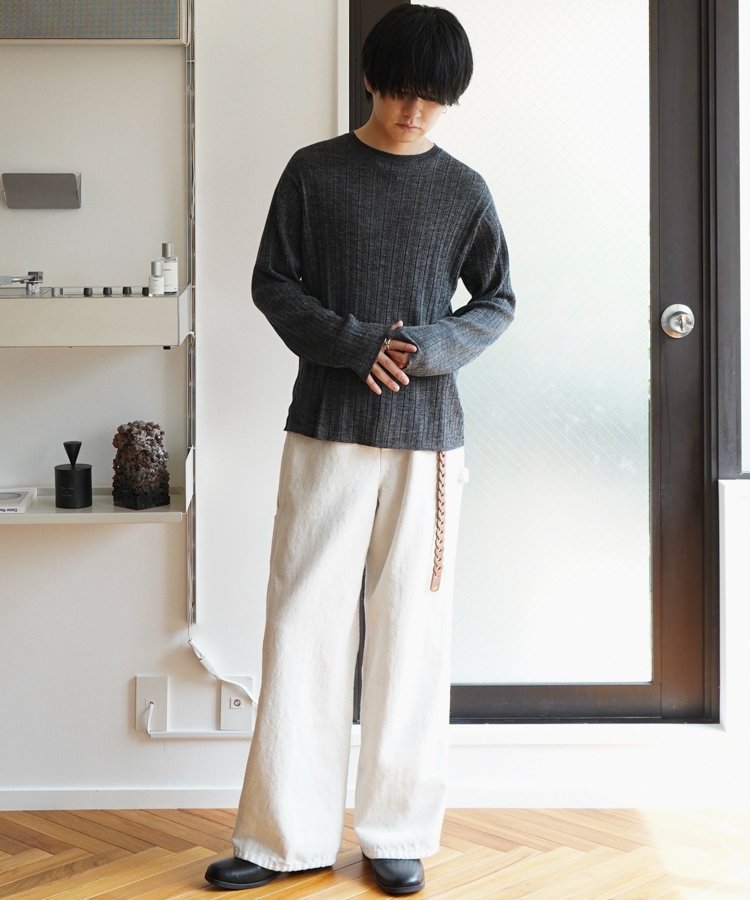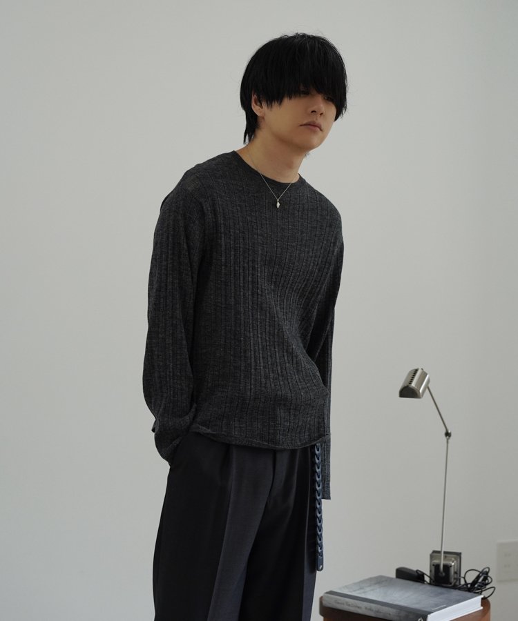 デザインソースはカットソーですが、あえてニットで編み立てることでランダムなリブの表情を際立てています。