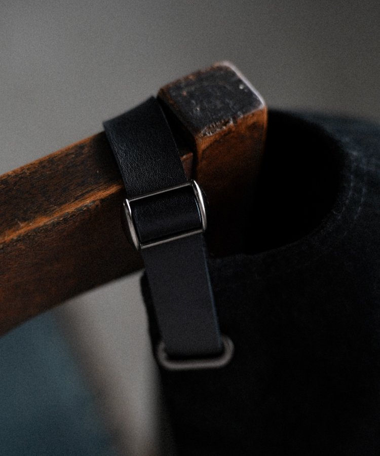 アジャスター部分にも銀面レザーを使用し、メタル素材のパーツでエッジを効かせました。