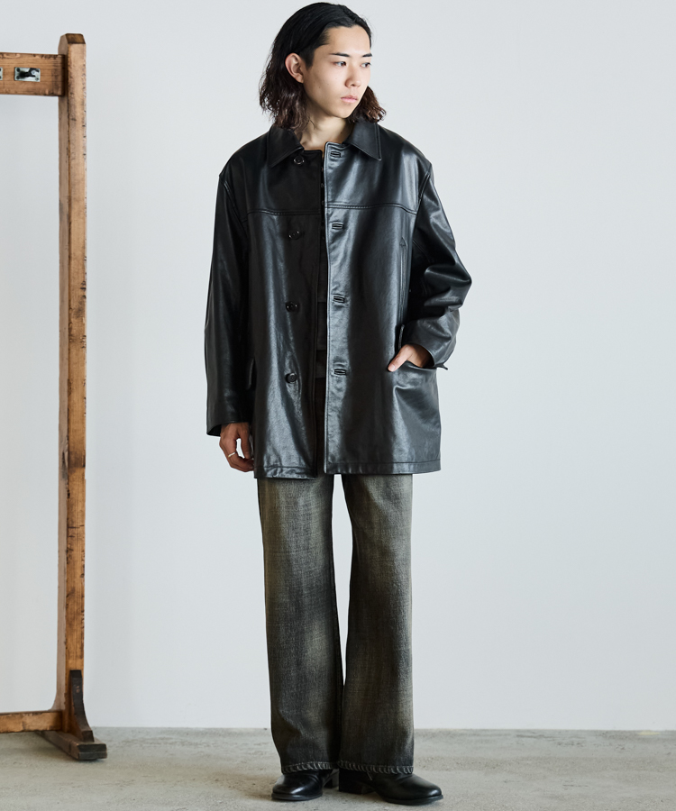 COTTON 100%岡山県の井原で織り上げた13.5ozのデニム素材。経糸に7/1、緯糸に10/1を打ち、経と緯で番手差を付けることで、ヴィンテージデニムらしい”縦落ち”の加工感を再現した設計です。ヴィンテージデニムの加工感を取り入れながらも、霧がかったフェード感を加えることで、ヴィンテージデニムにはない独特の違和感を表現しています。