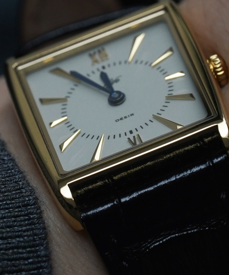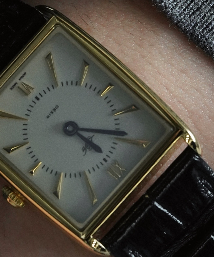 角形ケースの外周にアールデコ調の緩やかな曲線を取り入れ、横幅をわずかに広げたバランスに設計しています。